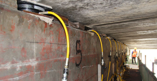 江廣高速公路改造工程JG-GG-2標(biāo)許莊周梓中溝中橋,采用24點(diǎn)同步頂升系統(tǒng)及千斤頂104臺將原有橋梁抬高50mm及舊支座進(jìn)行更換,此項(xiàng)目為泰州市重點(diǎn)城建項(xiàng)目、國家高速主干道京滬高速江都至廣陵段(簡稱江廣高速)改擴(kuò)建工程, 此次工程將對該橋進(jìn)行拼寬拓孔,即在原有位置往東側(cè)增加4孔,加長86米。